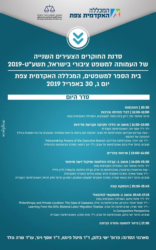 סדנת החוקרים תתקיים ביום ג', 30 באפריל 2019, בבית הספר למשפטים, המכללה האקדמית צפת. החוקרים הצעירים שייבחרו (בהליך שיפוט אנונימי), יציגו במהלך הסדנה את עבודתם, יקבלו משוב מחוקרים בכירים בתחום, ועבודתם תידון לעומקה בדיאלוג עם משתתפי הסדנה.