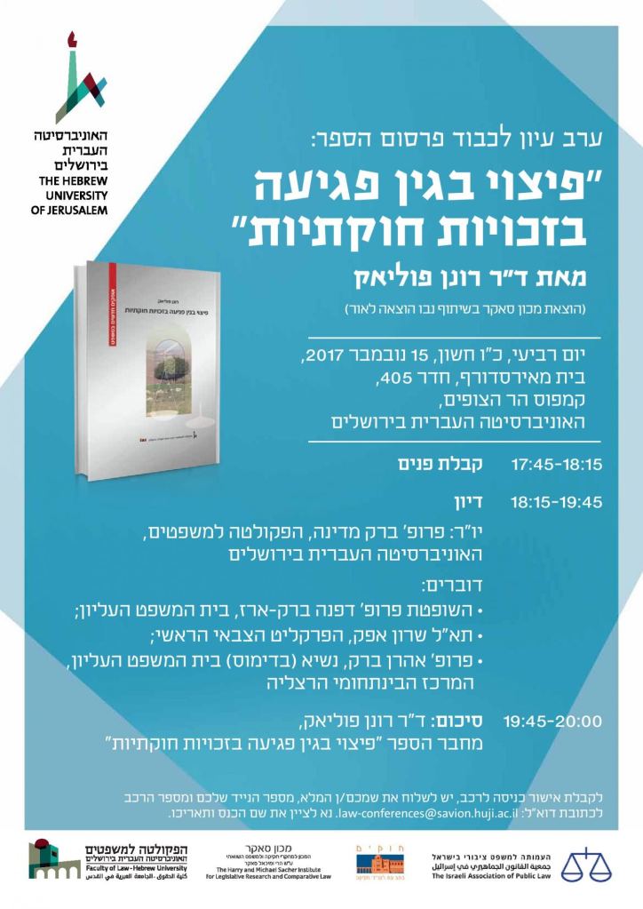 ערב עיון לכבוד פרסום הספר "פיצוי בגין פגיעה בזכויות חוקתיות". הספר נכתב על ידי ד"ר רונן פוליאק, חתן פרס גורני לחוקר צעיר לשנת 2015.